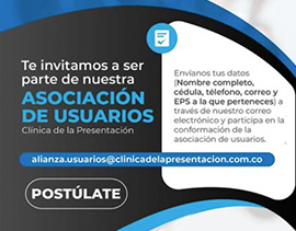 PUBLICACIÓNLa salud se construye entre todos La Política de Participación Social en Salud (PPSS) garantiza que personas, familias y comunidades sean parte activa en las decisiones sobre su bienestar. Con principios como la autonomía, la equidad y la inclusión, promovemos un sistema de salud más justo, transparente y participativo. 📢 ¡Tu voz también transforma la salud! Te invitamos a ser parte de nuestra ASOCIACIÓN DE USUARIOS. Envíanos tus datos (Nombre completo, cédula, télefono, correo y EPS a la que perteneces) a través de nuestro correo electrónico y participa en la conformación de la asociación de usuarios. Al correo 👇🏻 alianza.usuarios@clinicadelapresentacion.com.co